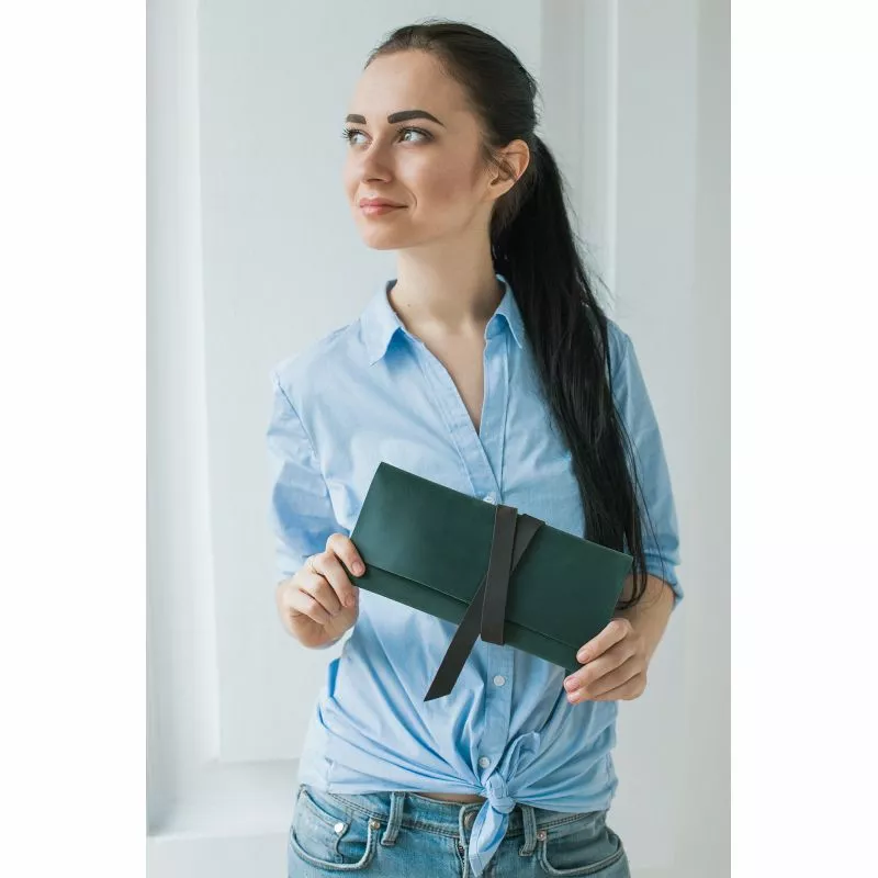 Это холдер для документов удобного размера, в котором поместятся посадочные талоны (или железнодорожные билеты), паспорта, деньги и масса других полезных вещей, которые должны быть всегда под рукой в путешествии. Холдер сделан полностью вручную из цельного куска очень плотной (2 мм) натуральной кожи. Закрывается он на кожаный хлястик, который  крепится двумя люверсами, по совместительству формирующими держатель для канцелярских принадлежностей.