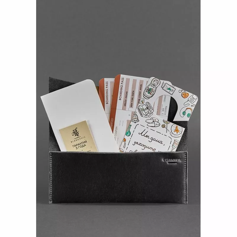 Это холдер для документов удобного размера, в котором поместятся посадочные талоны (или железнодорожные билеты), паспорта, деньги и масса других полезных вещей, которые должны быть всегда под рукой в путешествии. Холдер сделан полностью вручную из цельного куска очень плотной (2 мм) натуральной кожи. Закрывается он на кожаный хлястик, который  крепится двумя люверсами, по совместительству формирующими держатель для канцелярских принадлежностей.