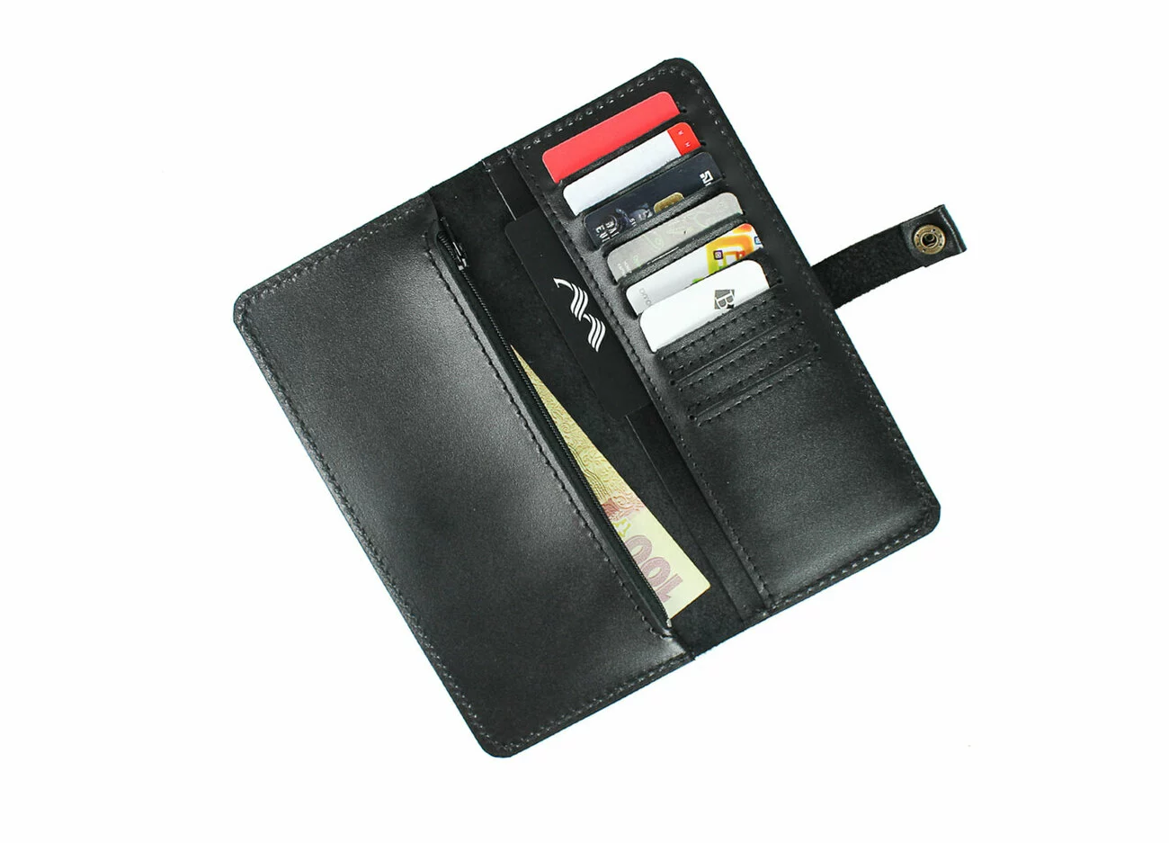 Размер: 9х20 см в закрытом виде Материал: кожа Застегивается на кнопку Внутри: – 8 отделений для карточек – 3 больших отделения для купюр – 1 отделение на молнии для мелочи Фурнитура: металлическая, цвет никель или антик