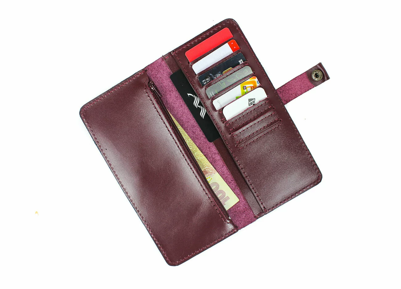 Размер: 9х20 см в закрытом виде Материал: кожа Застегивается на кнопку Внутри: – 8 отделений для карточек – 3 больших отделения для купюр – 1 отделение на молнии для мелочи Фурнитура: металлическая, цвет никель или антик