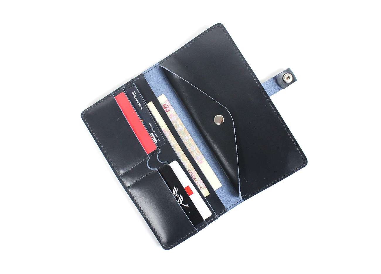 Розмір: 21х10 см – в закритому вигляді Матеріал: шкіра Застібається на кнопку Всередині: - 2 великих відділення для грошей та інших необіхідних для подорожі документів - 1 відділення на кнопці - 4 відділення для карток - 2 відділення для флешок