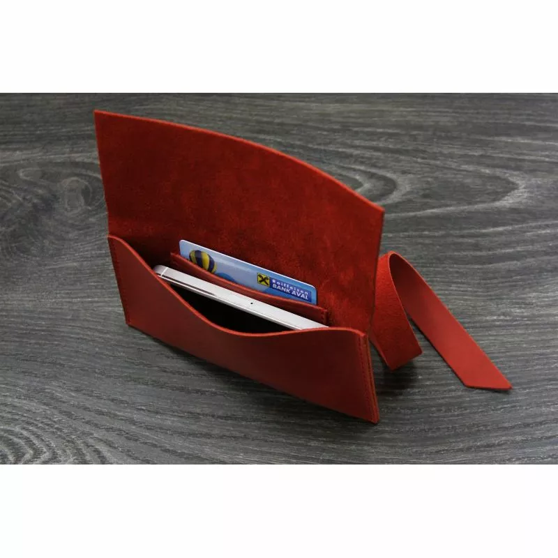 Чехол закрывается с помощью хлястика, внутри два отделения: для смартфона и небольшой кармашек для карточки.