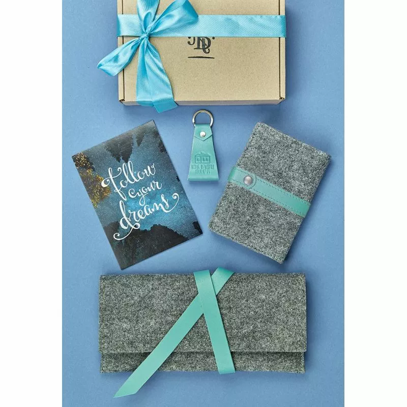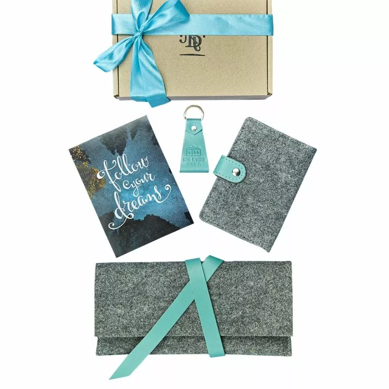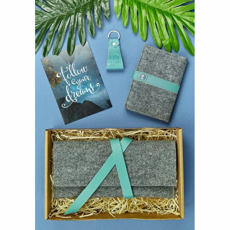 тревел-кейс с хлястиком (12х24 см), обложка для паспорта (14*10 см), брелок (9х4см), открытка (10х15 см).